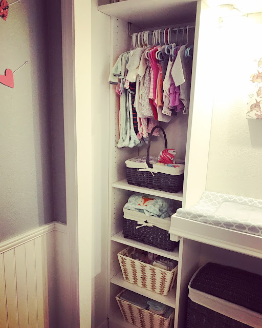 ^^ Almost done. This was before the finishing touches: getting a white 3-foot extension cord, hanging a bar for the clothes, and screwing the diaper basket to the wall. I was very glad that he kept an area for me to hang some of her clothes. What you see pictured are her newborn and 0-3 month pieces. The 3-6 month and 6-9 month outfits are in the closet. I need to wash everything this week, but we will probably also need to get a few preemie outfits (and diapers!) for her. We got enough Size 1 diapers from the baby shower to last a month!